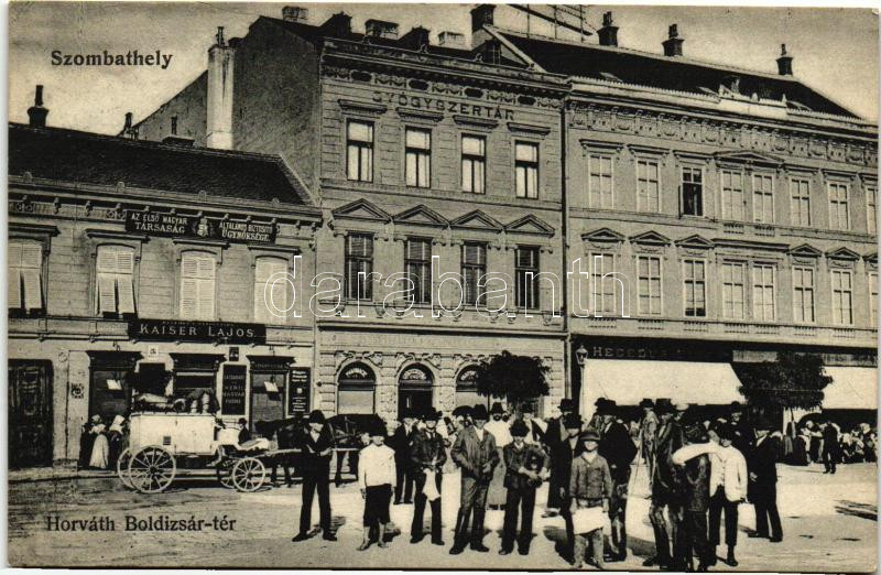 Szombathely, Horváth Boldizsár tér, Első Magyar Általános Biztosító Társaság, gyógyszertár, Kaiser Lajos, Hegedűs üzletei, kiadja Granitz Vilmos