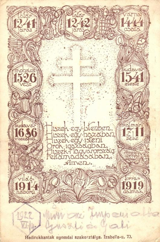 'Hiszek egy Istenben', kiadja a Hadirokkantakat foglalkoztat... https://www.darabanth.com/en/271-Online-auction/271.0/Postcards/Irredenta~200053/Hiszek-egy-Istenben-kiadja-a-Hadirokkantakat-foglalkoztato-es-gyamolito-szovetkezet-iparmu~II1211059