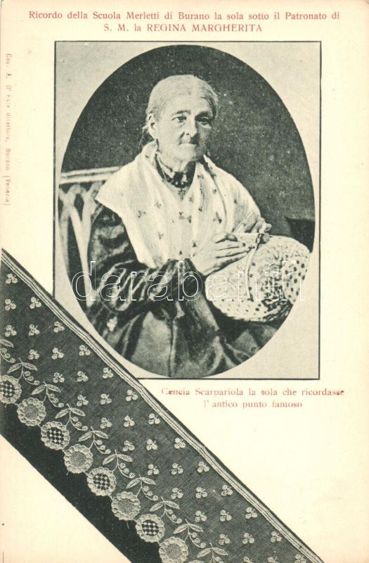 Description: Venice, Venezia; Cencia Scarpariola la sola che ricordasse l'antico punto famoso; Ricordo della Scuola Merletti di Burano la sola sotto il Patronato S.M. la Regina Margherita / Cencia Scarpariola, the only who remembers the old stitch, Lace School of Burano