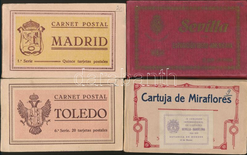 Description: 4 db RÉGI spanyol városképes képeslap füzet és leporello füzet, összesen 85 lappal; Madrid, Sevilla, Toledo, Miraflores / 4 pre-1945 Spanish town-view postcard booklet and leporello with 85 postcards