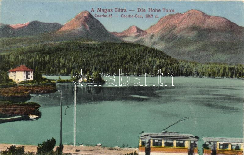 Tátra, Magas Tátra, Vysoké Tatry; Csorba tó, villamos / lake, tram