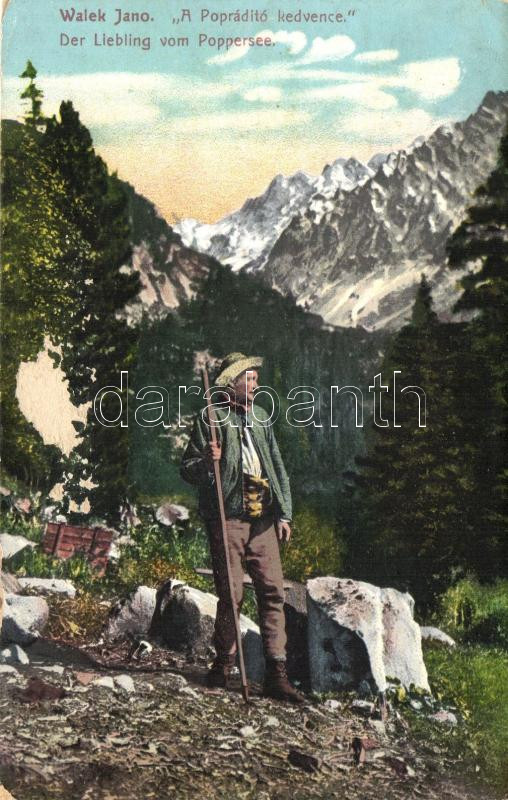 Tátra, Walek Jano a Poprádi-tó kedvence, Der Liebling vom Poppersee. Felvidéki népviselet, Cattarino Sándor utóda Földes Samu kiadása 1909. / highlander folklore (ázott / wet damage)