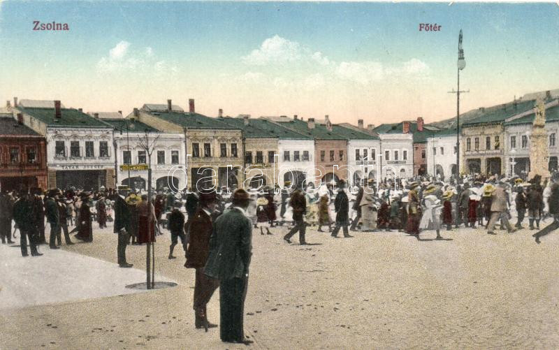 Zsolna, Zilina; Fő tér, Tatár József, Wecht Márk és Neumann Lipót üzle...