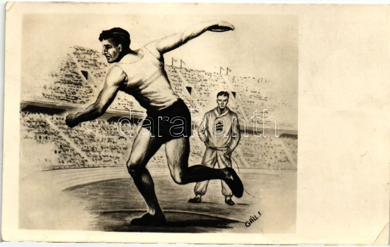 Description: 1953 augusztus 20. A Népstadion megnyitása, diszkoszvető, a Képzőművészeti Alap kiadása / Opening of the People's Stadium, discus thrower, s: Gáll. F. (EK)