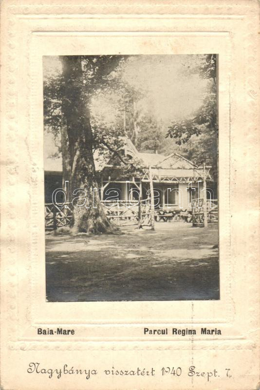 Description: 1940 Nagybánya, Baia Mare; Mária királynő park, vendéglő, ráragasztott fotó, kiadja Aladar Frankovits / Parcul Regina Maria / park, restaurant, glued photo '1940 Nagybánya visszatért' So. Stpl (b)
