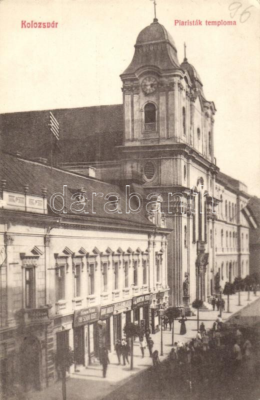 Kolozsvár, Cluj; Piaristák temploma, Hermann szabó üzlet,Muntyán Péter temetkezési vállalata, Somi Imréné, Schwartz József üzletei, kiadja Keszey Albert / chruch, taylor shop, undertaker, shops (EK)