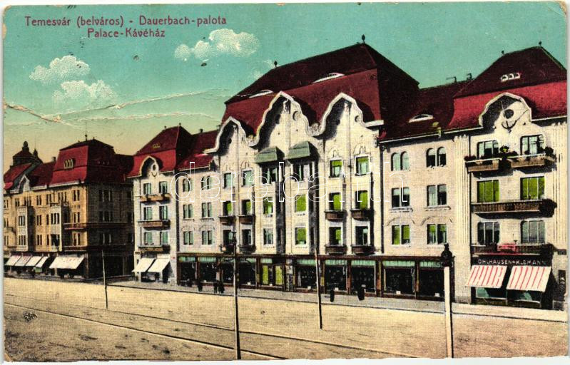 Temesvár, Timisoara; Belváros, Dauerbach palota, Palace kávéház, Ohlhausen és Klemann üzlete / palace, cafe (b)
