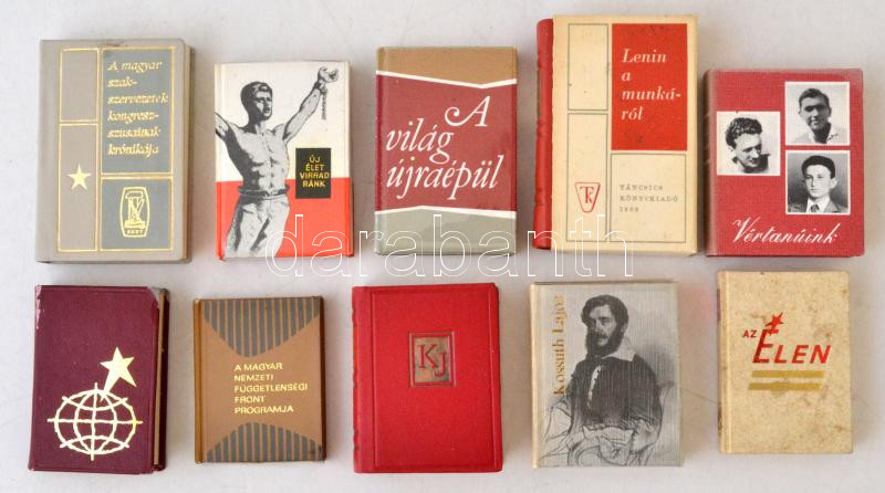 45 darabos minikönyvgyűjtemény, főleg munkásmozgalmi, kommunista, és szakszervezeti témában, változó állapotban, példányonként változó kötésben.