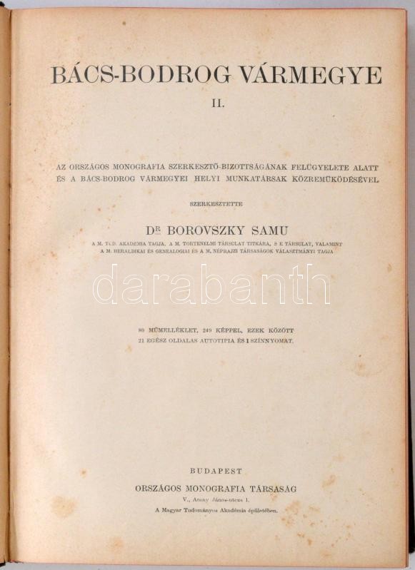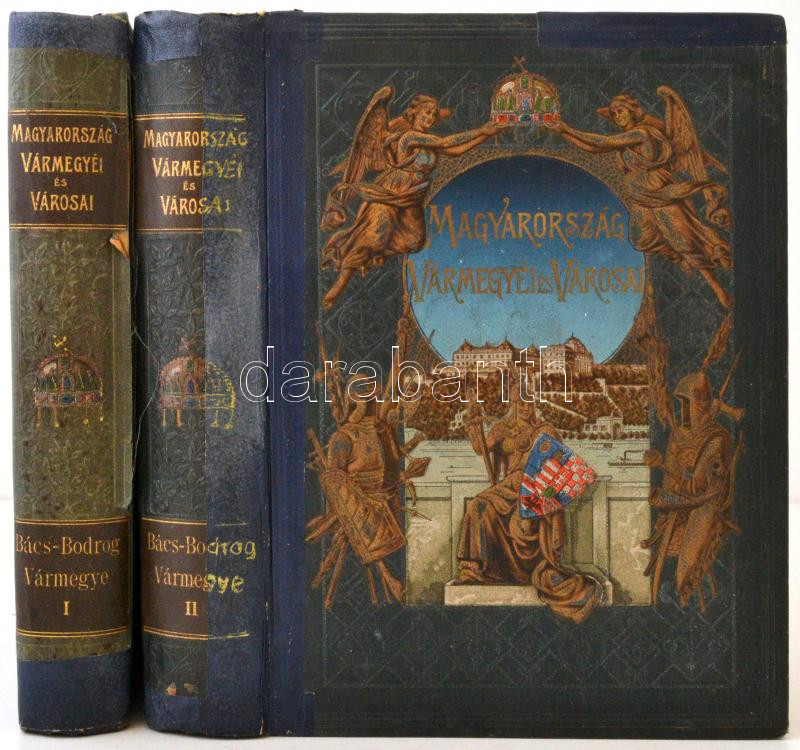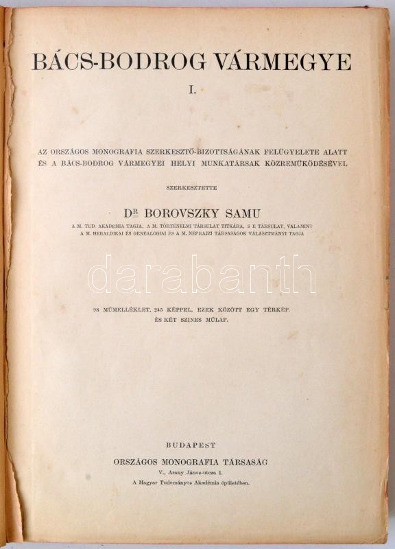 Dr. Borovszky Samu (szerk.): Bács-Bodrog Vármegye I-II. Magyarország vármegyéi és városai, Magyarország monográfiája. Több képpel, térképpel és műmelléklettel illusztrálva. Budapest, é.n. [1909], Országos Monográfia Társaság, 1 térkép+4+VI+ 477 [helyesen 475]+1 p.+ 2 t.; 4+616 p.+2 t. Kiadói aranyozott, festett, dombornyomott egészvászon kötés, színezett lapszélekkel. Az első kötet gerince sérült, javított. A borítója kopott. Az előzéklap hiányzik. A második kötet gerince javított. A borítója kopott.