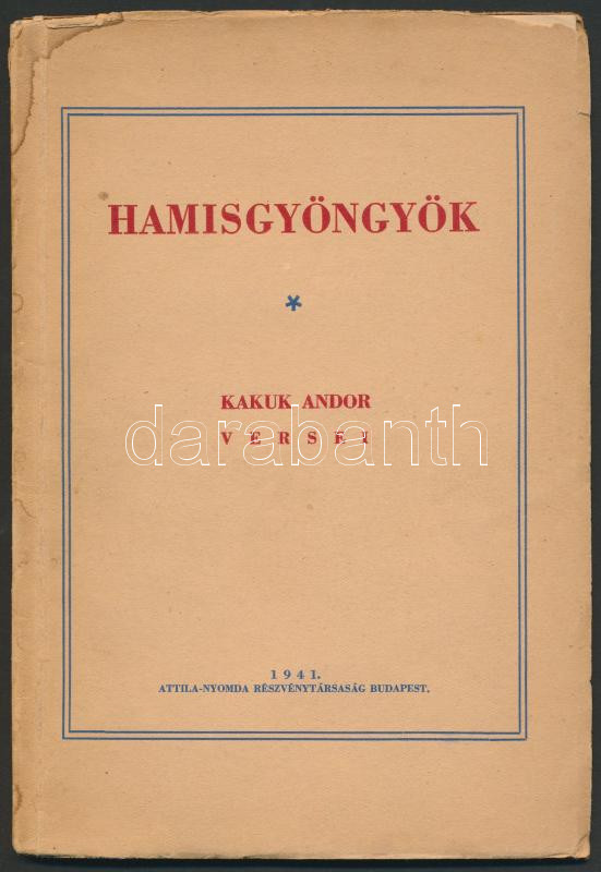Description: Hamisgyöngyök, melyeket egy lány kedvéért akasztott magára egy fiú. Kakuk Andor versei. Bp., 1941, Attila-Nyomda. Kiadói papírkötés, kissé foltos állapotban.