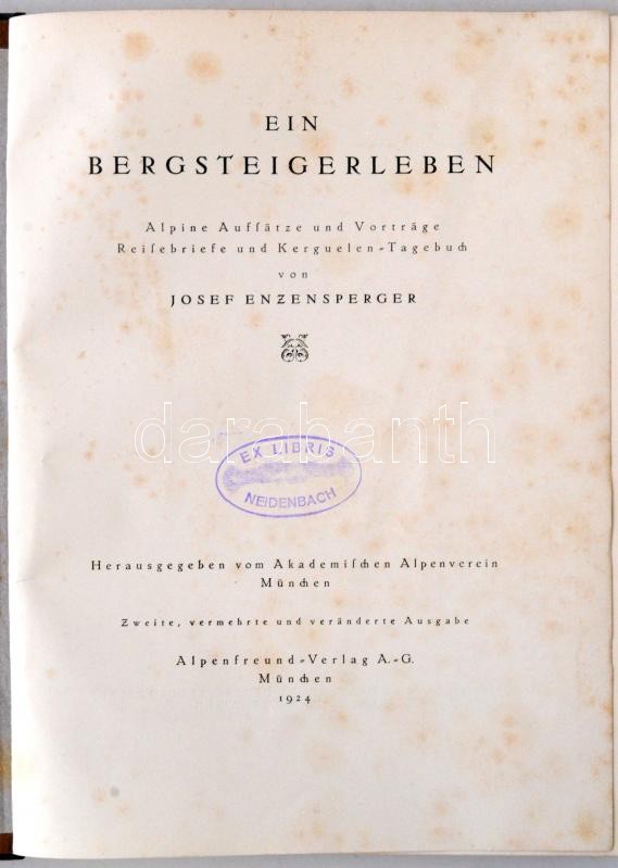 Josef Enzensperger: Ein bergsteigerleben. Alpine Auflatze und Vortrage Reisebriefe und Kerguelen. München, 1924, Akademischen Alpenverein, Alpenfreund Verlag, 295 p. Kiadói egészvászon kötés. Számos szövegközti, és egészoldalas fekete-fehér képpel illusztrálva. Az egészoldalas képek előtt hártyapapírral. Josef Enzensperger: Egy túracipő élet, német nyelven. Ex libris-szel. A gerince fakó, pár lap némileg foltos. / Linen-binding, in german language, with ex libris, the spine is pale, and some page are a little bit spotty.