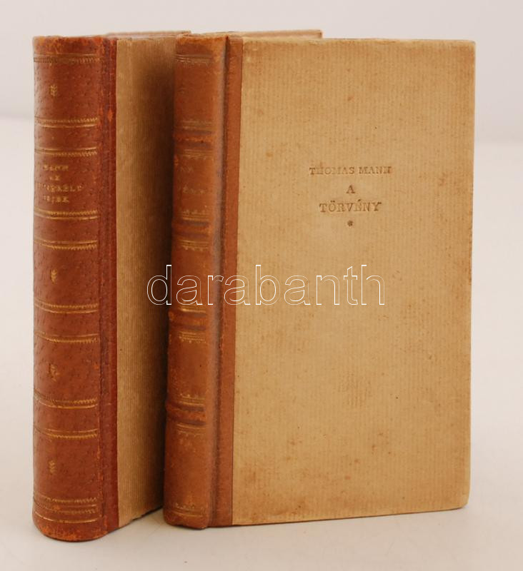 Két kötet az Új Elzevír Könyvtárból; Thomas Mann: Az elcserélt fejek. Új Elzevír Könyvtár 1. Fordította: Horvát Henrik. Az illusztrációkat Kondor Lajos rajzolta. 1980. számú példány. Budapest, 1957, Magyar Helikon. Kiadói félbőr kötés, 235 p. Thomas Mann: A törvény. Új Elzevír Könyvtár 2. Fordította: Vajda Endre. Drahos István fametszeteivel illusztrálva. Budapest, 1958, Magyar Helikon. Kiadói félbőr kötés, 172 p. A borítók kopottak. Drahos István eredeti fametszeteivel. Sorszámozott, bibliofil kiadás egészbőr kötésben. Bp., 1958, Magyar Helikon, (pár lap kijár)