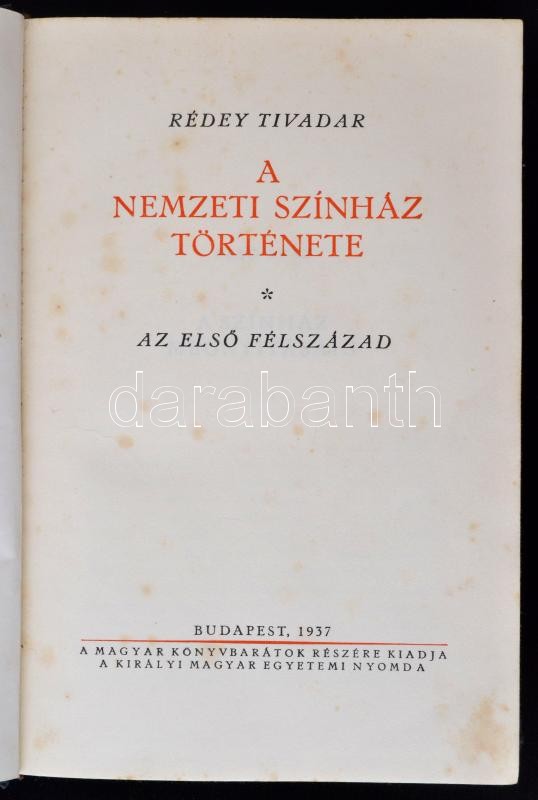Rédey Tivadar: A Nemzeti Színház története. Az első félszázad. Budapes... https://www.darabanth.com/en/272-Online-auction/272.0/Books/Books-Other-rarities~45/Redey-Tivadar-A-Nemzeti-Szinhaz-tortenete-Az-elso-felszazad-Budapest-1937-Kiralyi-Magy~II1361359