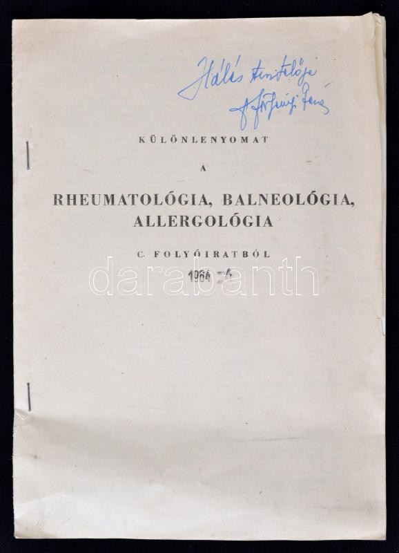 Description: Dr. Görgényi Géza: A reuma-gondozás megszervezése a Budapest Fővárosi Tanács VI. kerületében. Különlenyomat a Rehumatológia, Balneológia, Allergológia c. folyóiratból. Budapest, 1964, Medicina Egészségügyi Könyvkiadó. Tűzött papír, 7 p. Két melléklettel. A szerző dedikációjával.