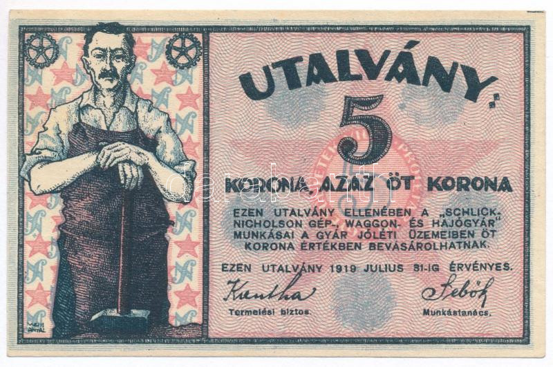 Budapest 1919. "Schlick Nicholson Gép-Waggon- és Hajógyár" 5K utalvány T:I- Adamo BUC-244.3