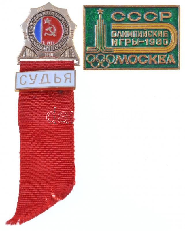 Szovjetunió 1980. "Moszkvai Olimpia" zománcozott fém jelvény + DN "Spartakiád - Bíró" fém jelvény szalaggal T:2