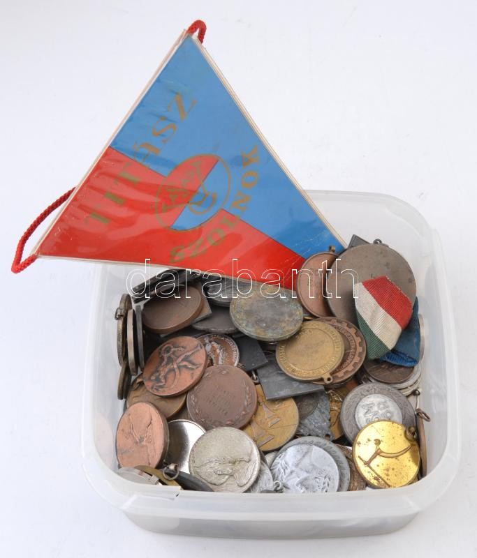 Vegyes dobozonyi sportérem tétel valamint néhány zseton, közte 1907. "Magyar Úszószövetség" fém emlékérem (34mm), DN "Magyar Testgyakorlók Köre (MTK) 1888 / Bátorság Buzgalom Barátság" fém emlékérem (34mm) + "TITÁSZ - Vasas SC - Szolnok" csapatzászló (126x224mm) T:vegyes