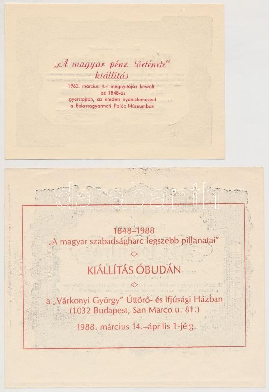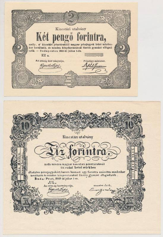 Description: 1849. 2Ft "Kincstári utalvány" 1962-es utánnyomata "A magyar pénz története kiállítás" felülbélyegzéssel hátlapján + 1849. 10Ft másolata "1848-1988 A Magyar szabadságharc legszebb pillanatai - Kiállítás Óbudán" felülbélyegzéssel a hátlapján / reprint T:I-