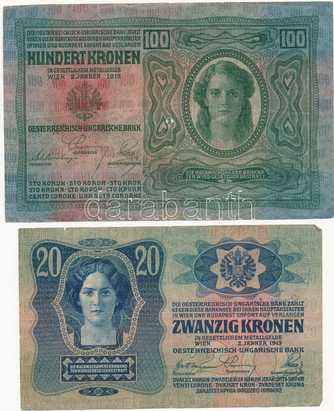 1912. 100K + 1913. 20K mindkettő hamis ""Bács-Bodrog Vármegye Péterréve Község" felülbélyegzéssel (fake overprint) T:III,III- ly.