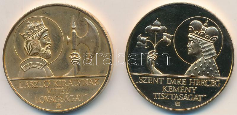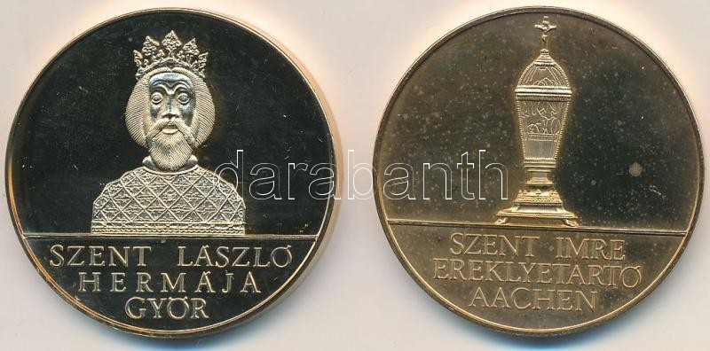Description: Fülöp Zoltán (1951-) DN "Szent Imre herceg kemény tisztaságát / Szent Imre ereklyetartó Aachen" aranyozott Br emlékérem (40mm) + "László királynak vitéz lovagságát / Szent László hermája Győr" aranyozott Br emlékérem (40mm) T:2 (PP) ujjlenyomat,karc