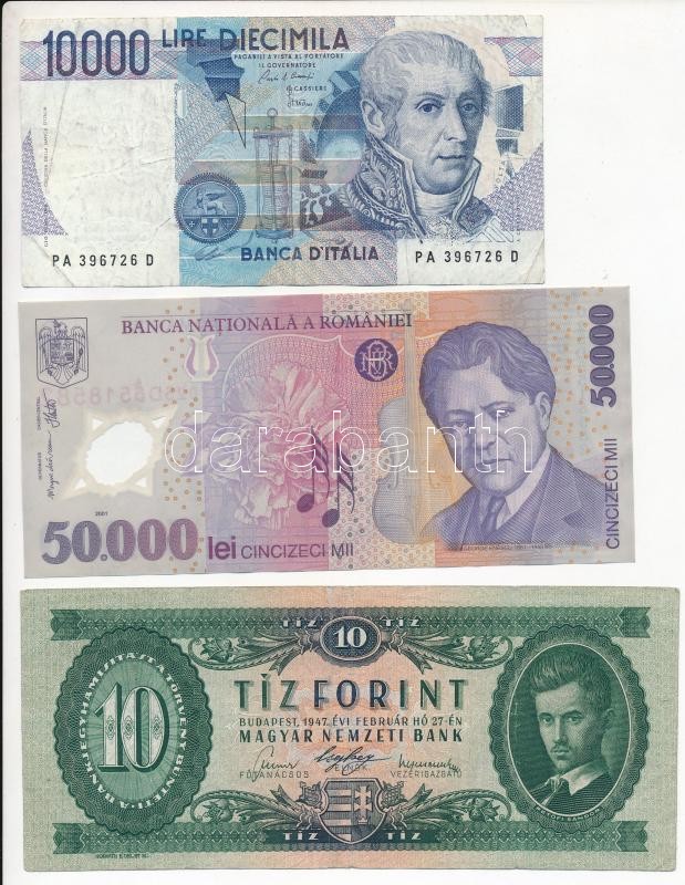Mixed: Hungary 1944. 2 Pengő "Red Army Headquarters" + 1947. 10 Forint + 2006. 200 Forint + Romania 1941. 1000 Lei + 2001. 50.000 Lei + Italy 1979. 500 Lira + 1984. 10.000 Lira + GDR 1971. 10 Mark C:VF,F