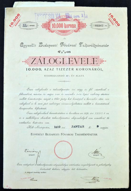 https://www.darabanth.com/en/272-Online-auction/272.0/Numismatics/Shares-and-Tickets~300005/Budapest-1910-Egyesult-Budapesti-Fovarosi-Takarekpenztar-zaloglevele-10000K-rol-szaraz~II1381145
