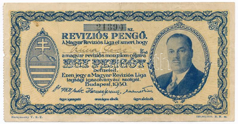 Budapest 1930. "Revíziós Pengő" arcképes változat, kitöltött...