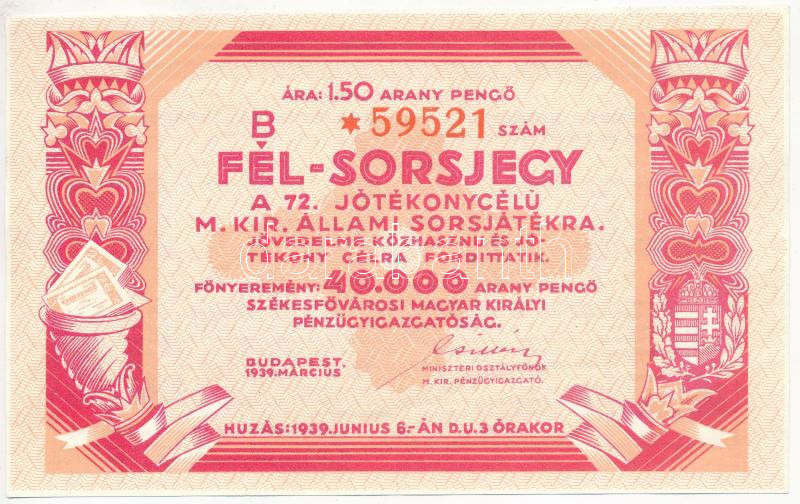 Budapest 1939. "A 72. Magyar Királyi Állami Sorsjáték" 1,50 Aranypengő értékű fél-sorsjegye, csillagozott sorszámmal, pecsételéssel T:II