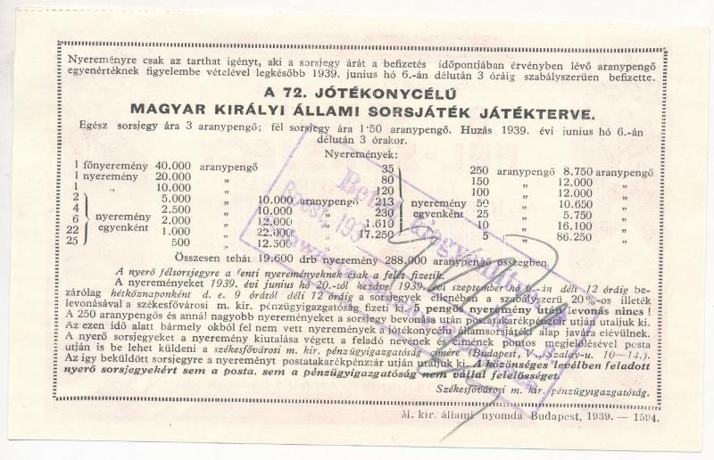 Budapest 1939. "A 72. Magyar Királyi Állami Sorsjáték" 1,50 ...