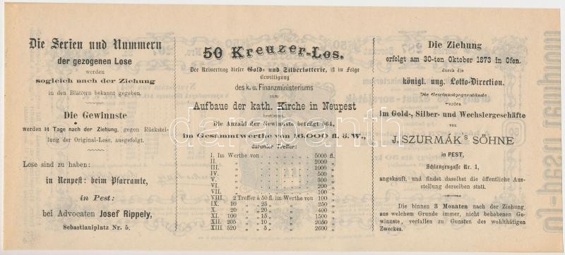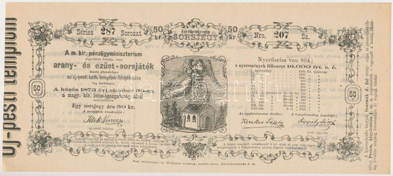 Pest 1873. "A Magyar Királyi Pénzügyminisztérium arany- és ezüst sorsjátéka az Újpesti Katolikus Templom felépítésének javára" 50kr értékben T:I-