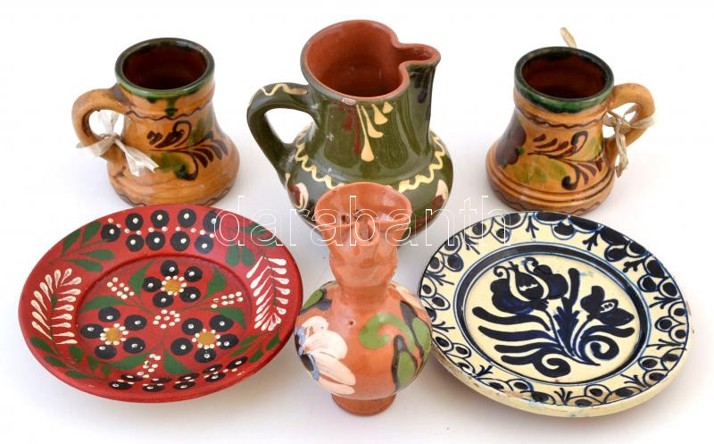 Vegyes kerámia tétel, népi mintás dísztárgyakkal(kis kancsók, tálka, korsó), némelyiken kis lepattanásokkal, 6 db
