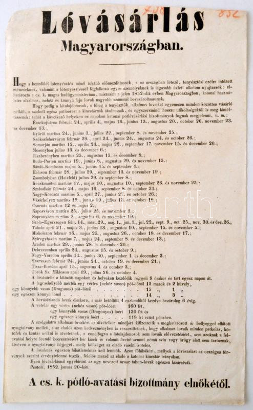 1852 Az egész országra szóló katonai lóvásárlási hirdetmény, mely tele...
