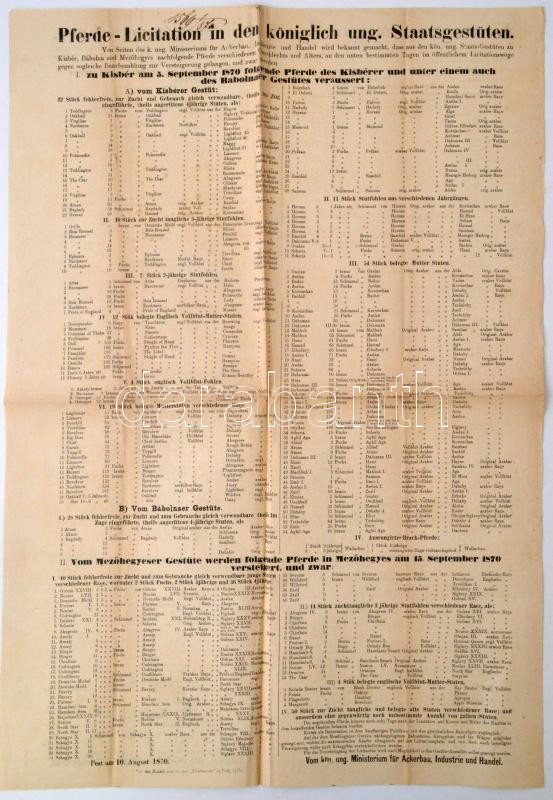 1870 A királyi ménesek lóárverési hirdetménye a bábolnai és a mezőhegy...