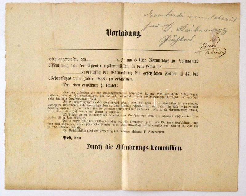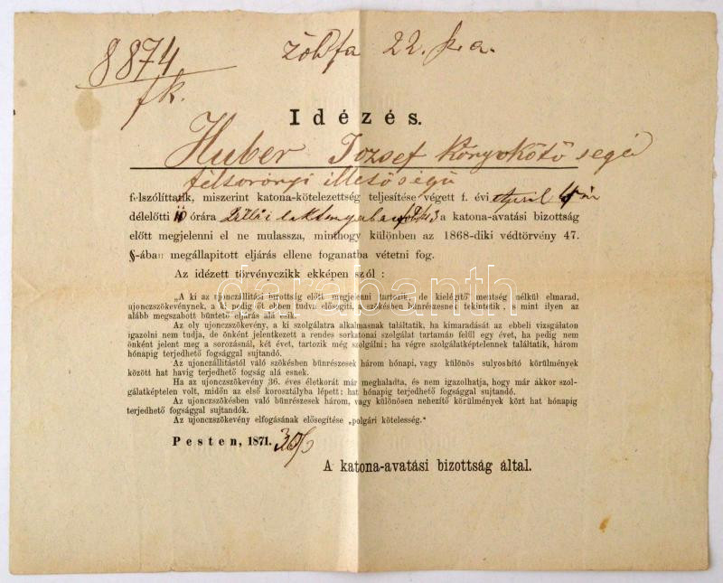 1871 Sorozásra való idézés könyvkötő segéd részére, magyar és német nyelve, jó állapotban, 22x27cm