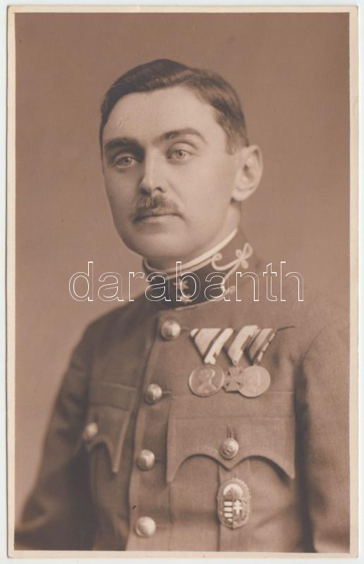 cca 1930 Vitéz katona kitüntetésekkel, fotólap Könnyű József fényképés...