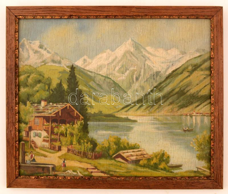 Csonti jelzéssel: Alpesi táj, vízparttal, olaj, falemez, fakeretben, 3...