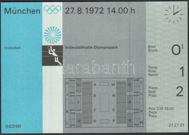 1972 München Olimpiai belépő röplabdára, szép állapotban / 1972 Munich Olympic ticket for wolleyball in good condition, 10,5x15cm