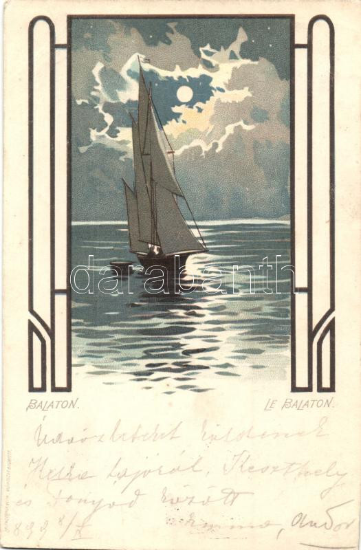 1899 Balaton, vitorlás, kiadja Bruchsteiner és fia, Art Nouveau litho