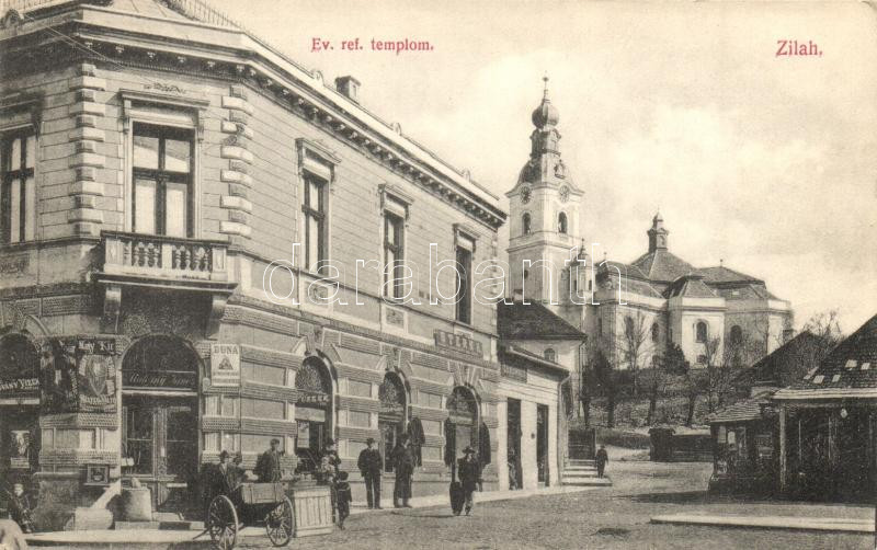 Zilah, Zalau; Református templom, Stern R. üzlete, kiadja Seres Samu / church, shops
