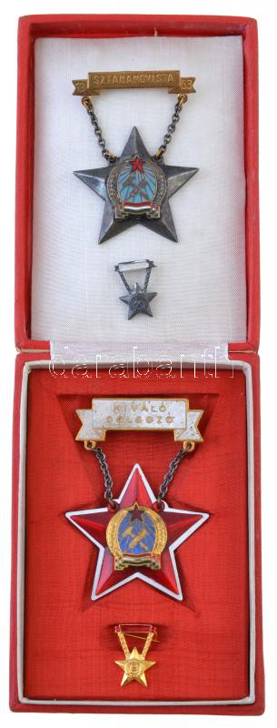 ~1950. "Kiváló dolgozó" zománcozott fém kitüntetés Rákosi-címeres tokban, miniatűrrel + 1953. "Sztahanovista" zománcozott fém kitüntetés miniatűrrel T:2