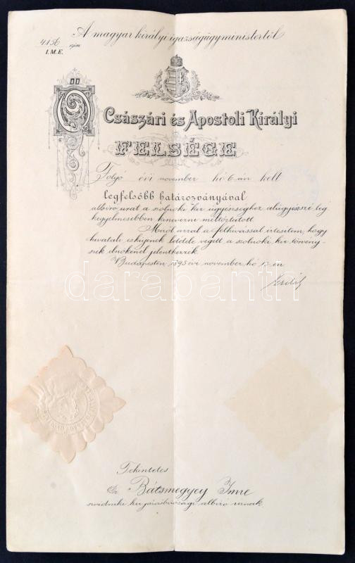 1895 Alügyészi kinevezés dr. Bátsmegyey Imrének Erdély Sándor (1839-19... https://www.darabanth.com/en/273-Online-auction/273.0/Other-collectibles/Autographs~45/1895-Alugyeszi-kinevezes-dr-Batsmegyey-Imrenek-Erdely-Sandor-1839-1922-igazsagugyminiszt~II1392226
