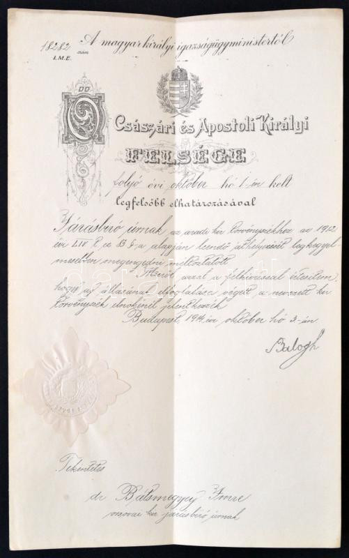 Description: 1914 Áthelyezési határozat az aradi királyi törvényszékhez dr. Bátsmegyey Imre járásbírónak Balogh Jenő (1864-1953) igazságügyminiszter aláírásával, szárazpecséttel, okmánybélyeggel, pecséttel.