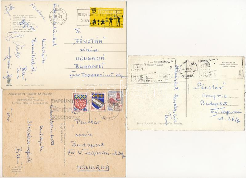 cca 1967 Az újpesti labdarúgó csapat tagjainak (Mathesz, Bene, Farkas, stb.)aláírásai külföldi helyekről küldött 3 db levelezőlapon