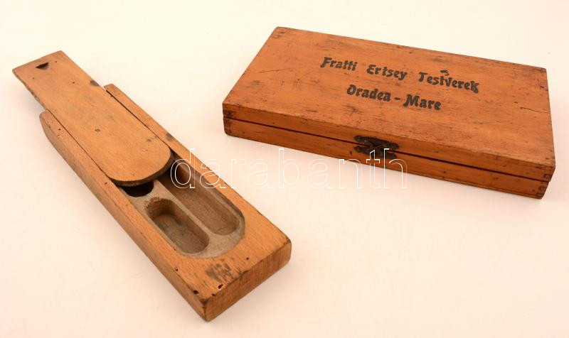 2 db. fadoboz, Fratti Ertsey Testvérek Oradea-Mare (Nagyvárad), Írószertartó, foltosak, kisebb kopásokkal, 13x25x4 cm, 7x23x2 cm.