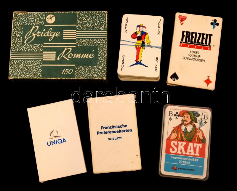 7 pakli kártya (2 egy csomagban, összesen 6 csomag), köztük 5 pakli Ferd.Piatnik&Söhne gyártmányú kártya,