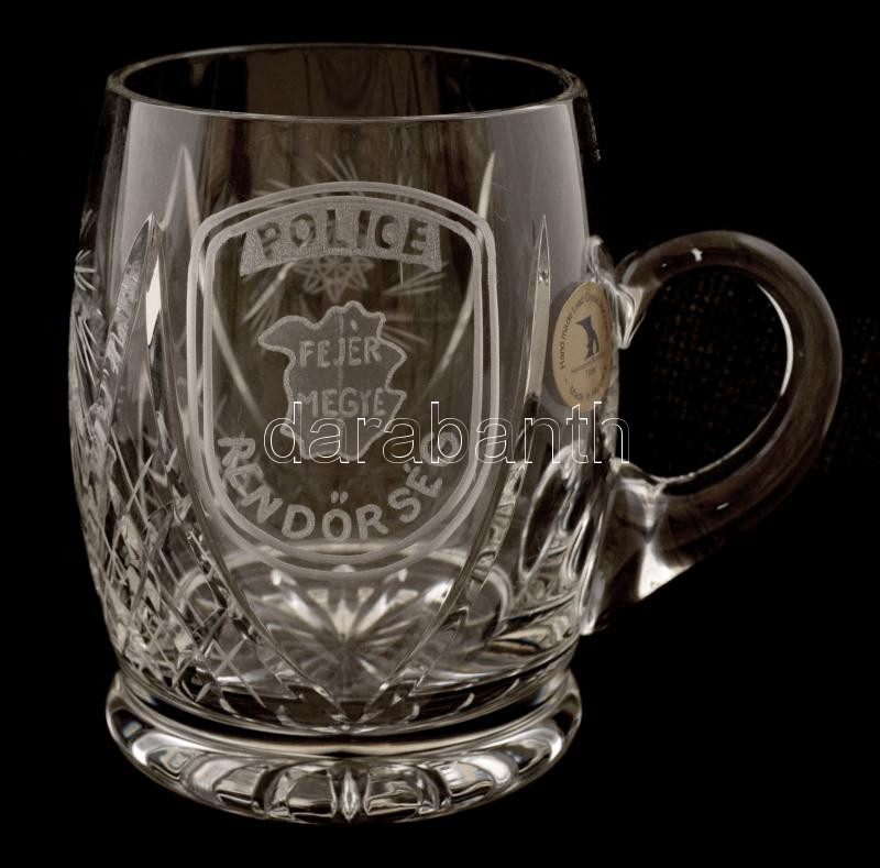 Ólomkristály sörös korsó, "Police Fejér megye" felirattal, csiszolt, h...