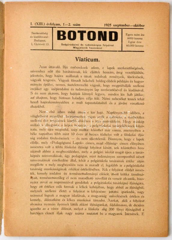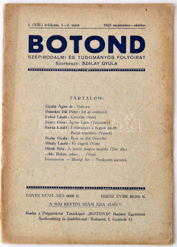 1925 Botond, Szépirodalmi és Tudományos Folyóirat, Szalay Gyula szerk....