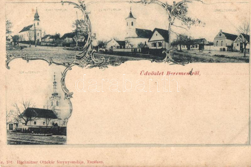 Beremend, Zsinagóga, római katolikus, evangélikus, görög katolikus templomok, kiadja Rechnitzer Ottokár, Art Nouveau (vágott / cut)