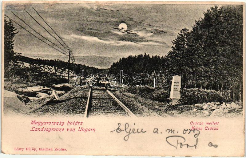 Csaca, Cadca; Magyarország határa, vasúti sín hajtánnyal / Hungarian b...