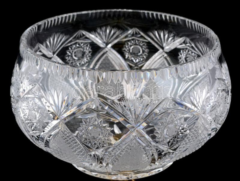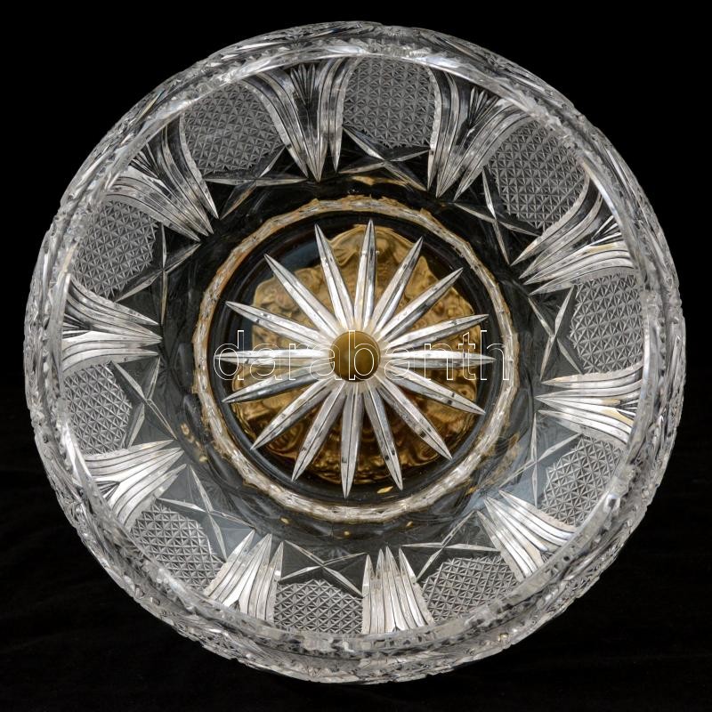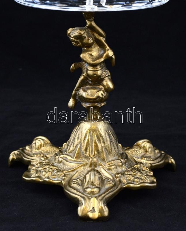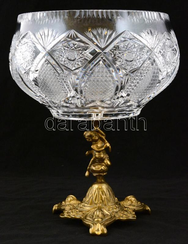Dekoratív asztalközép csiszolt ólomkristály tállal, réz öntött talapzattal, m:28 cm, d:19 cm